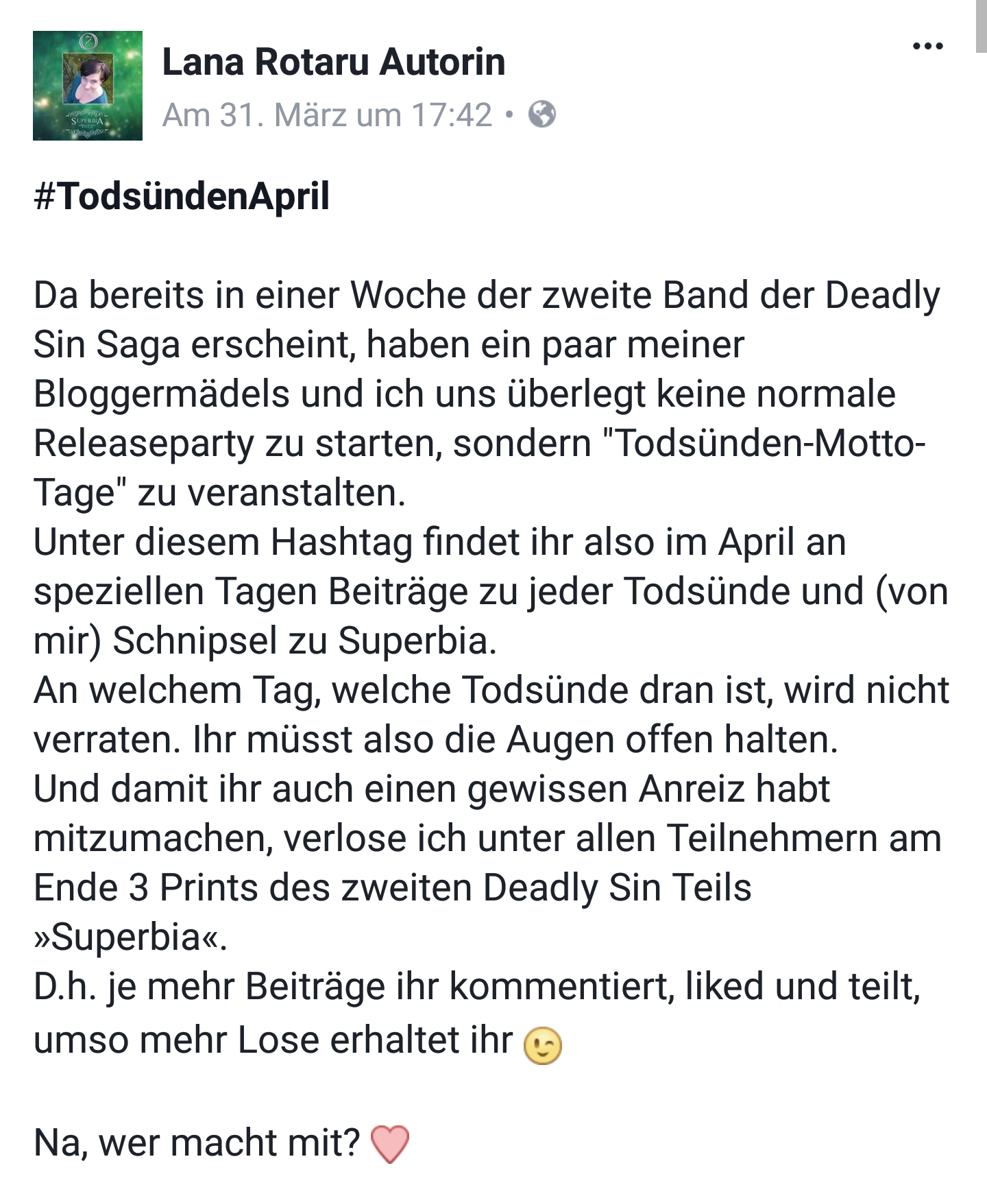 Auf der Facebookseite der Autorin findet ihr den Großteil der Beiträge geteilt, oder halt unter dem #TodsündenApril !
